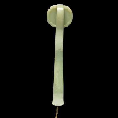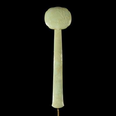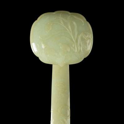 LARGE CHINESE CARVED PALE CELADON JADE 'PARTRIDGE AND GRAIN' RUYI SCEPTRE