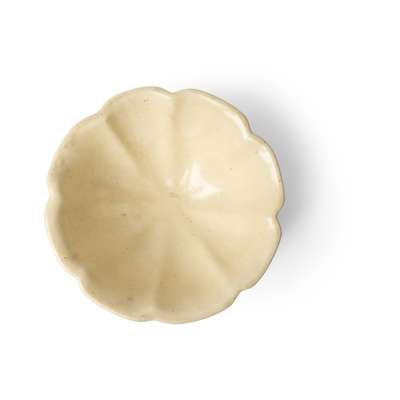 of lobed form, covered inside and out with a creamy white glaze stopped evenly above foot revealing buff stoneware body