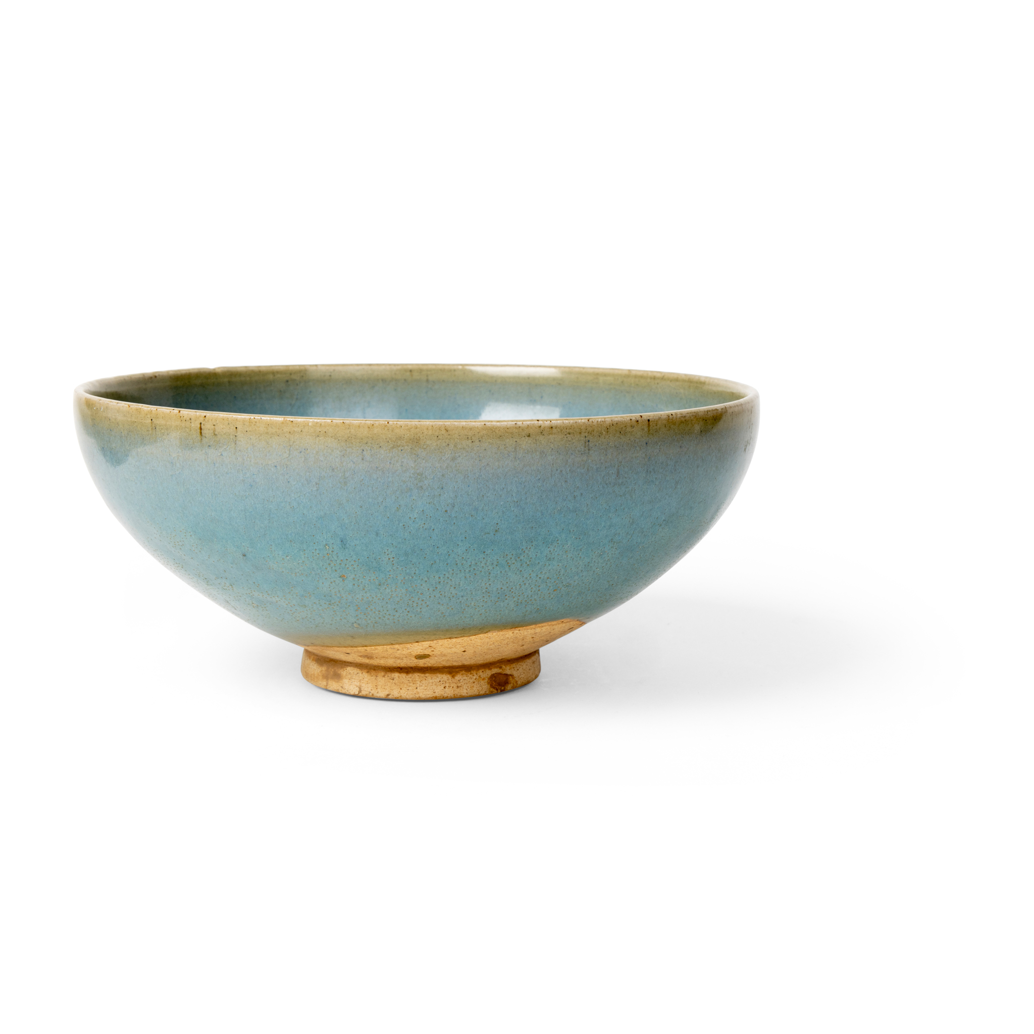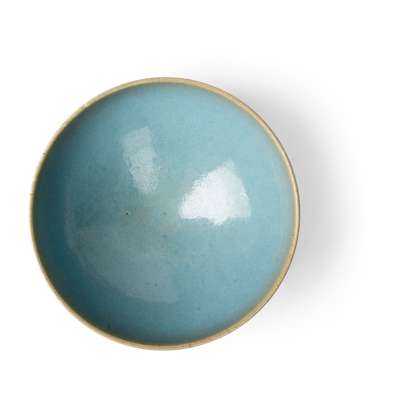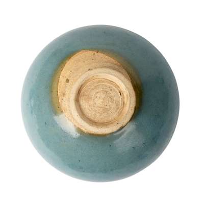 potted with deep rounded sides rising from slight everted short foot to straight mouth, covered inside out with a thick sky blue glaze thinning to a beige tone on the mouth rim and stopping unevenly above the foot