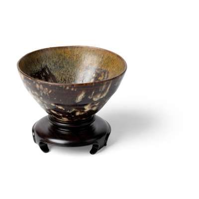 the rounded conical body resist-decorated on the interior with three rectangular motifs, all reserved in dark brown against the variegated, milky buff ground, the exterior covered in a 'tortoiseshell' glaze of dark brown colour mottled in beige that falls irregularly to the foot, with a wooden stand