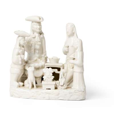 moulded as a man known as Governor Duff seated next to his wife at either side of a table with a bowl containing food, he in a frock coat and tricon hat, similar to his son standing before him, the mother and daughter dressed in skirts and hooded cloaks, all on a pedestal with a dog and monkey