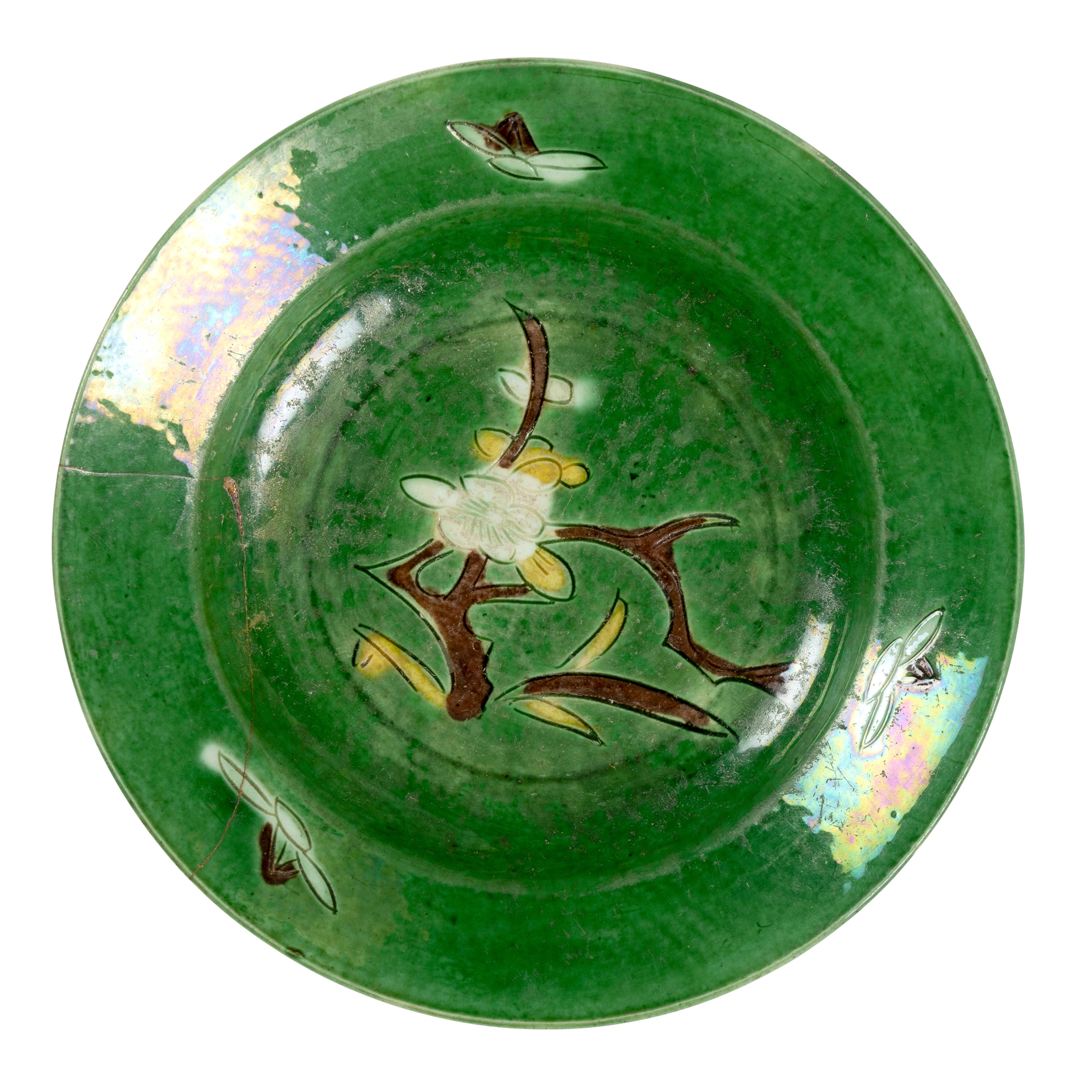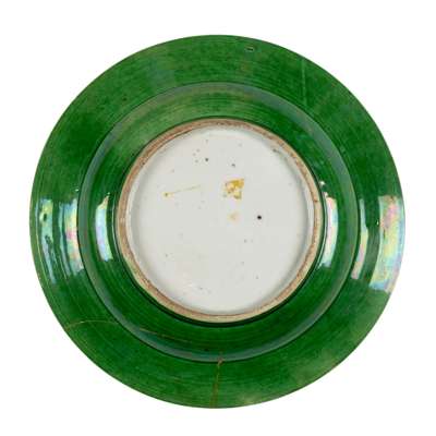 incised with flowering prunus in the central medallion, enamelled with white, yellow, and brown on the decorations on a green ground