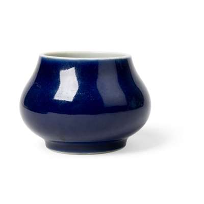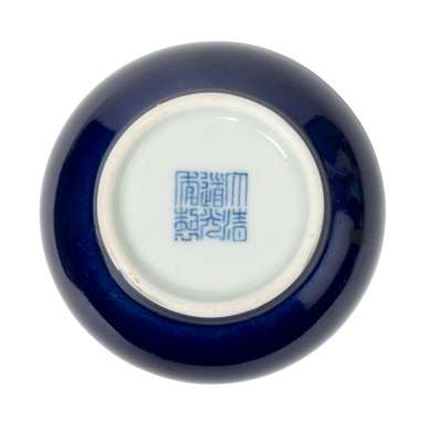 with rounded sides rising to a straight mouth, covered overall on the exterior with a dark blue glaze, the base inscribed with a six-character Daoguang mark in underglaze blue