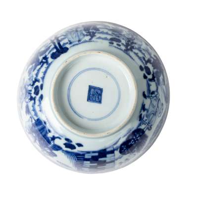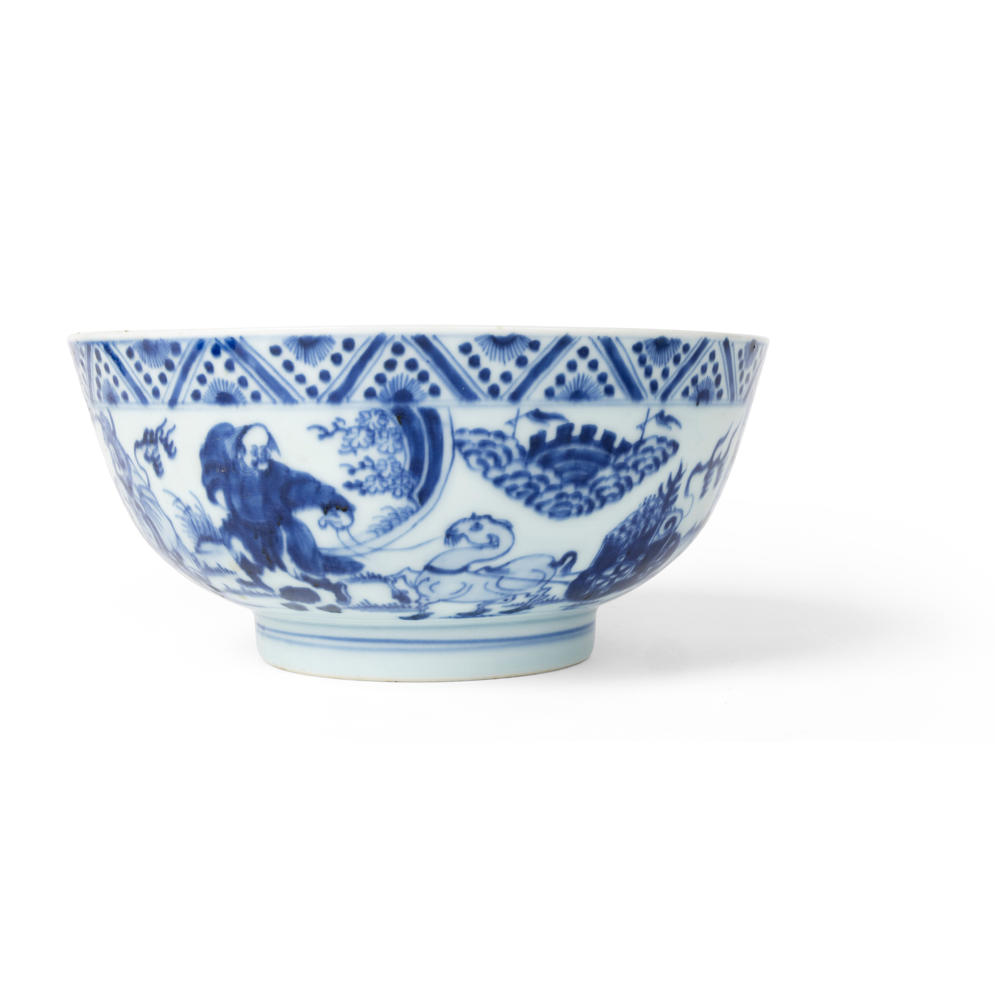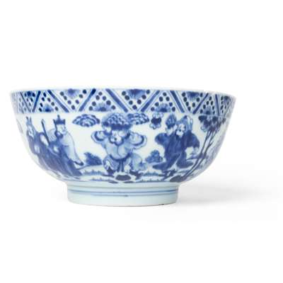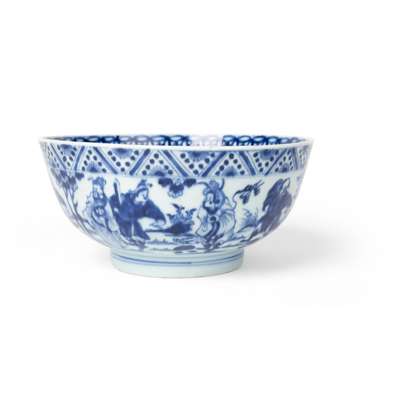 A closely comparable blue and white bowl with similar tribute bearers and decoration, dated to the Qing dynasty, 17th/18th century, was sold at Sotheby's New York, 27 September 2022, lot 631; another related Qing dynasty, 18th century bowl was offered at Bonhams London, 6 November 2008, lot 24.
