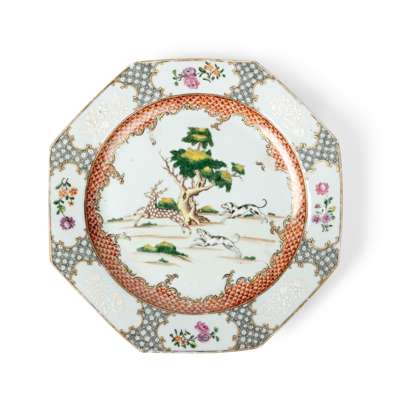 [PRIVATE ENGLISH COLLECTION, LONDON] CHINESE EXPORT FAMILLE ROSE 'DOGS AND DEER' OCTAGONAL PLATE