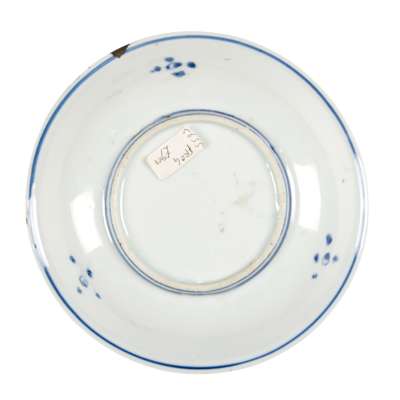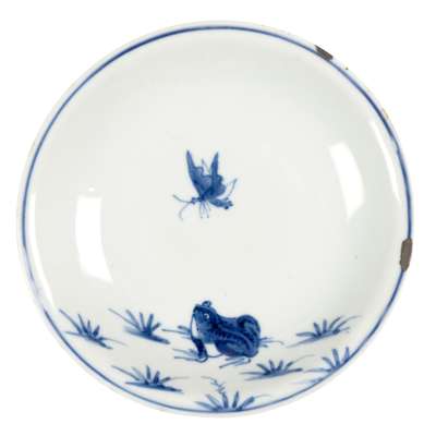 A Ming dynasty blue and white dish of similar frog and butterfly dish, dated to Jiajing to early Wanli c.1560-1585, was probably the prototype of Ko-Sometsuke, was in the Robert McPherson Antiques, stock number: 27076. For a set of five dishes of this design, see Exhibition of Ming Blue and White: Jiajing – Chongzhen, Including Dated Examples, S. Marchant & Son, London 2004.