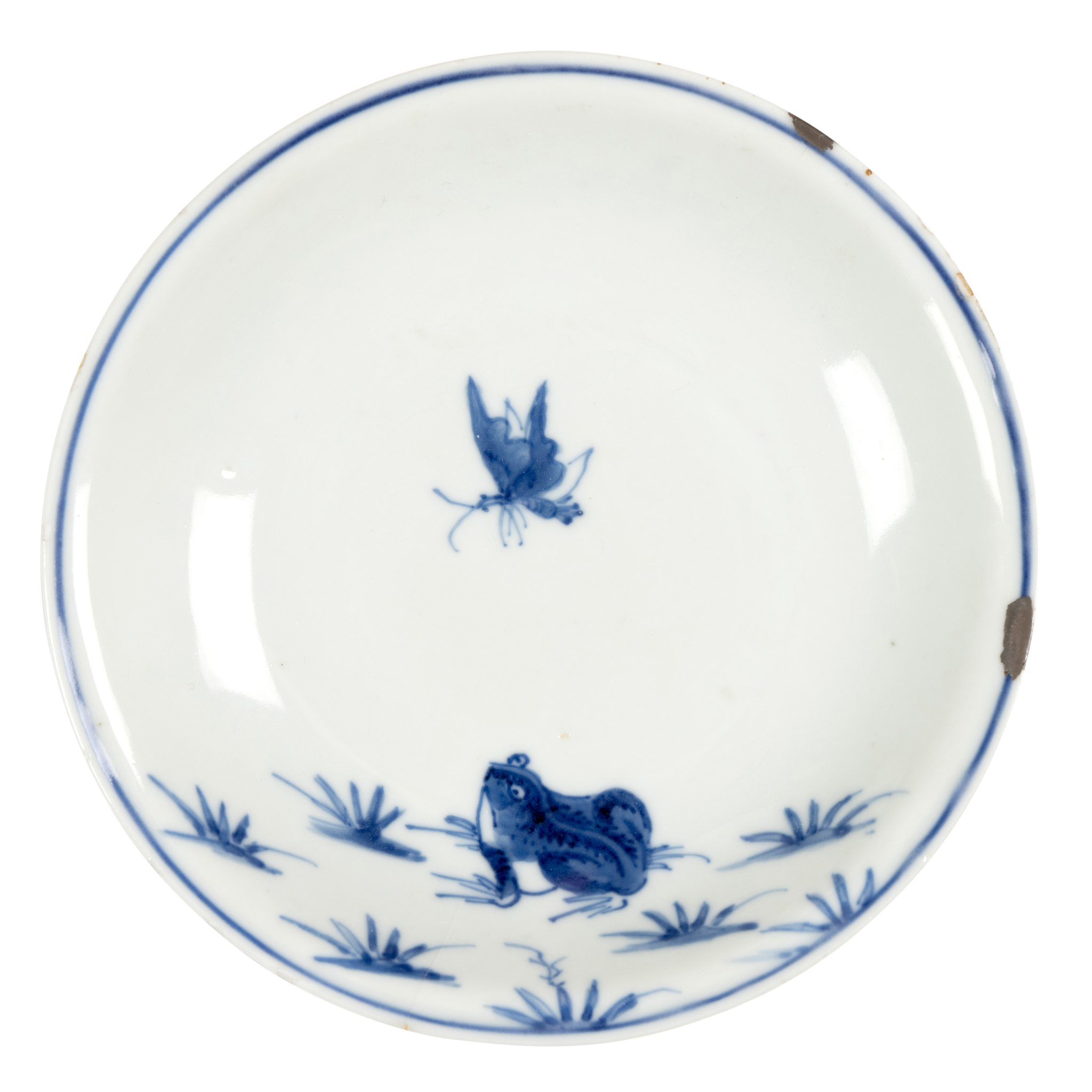 RARE CHINESE BLUE AND WHITE KO-SOMETSUKE 'FROG AND BUTTERFLY' DISH
