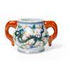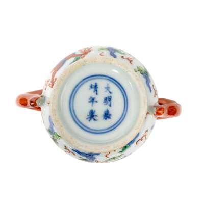 of gui form, flanked on either side with large loop handles, painted on both sides with dragons, the base inscribed with a six-character Jiajing mark in underglaze blue within double circles