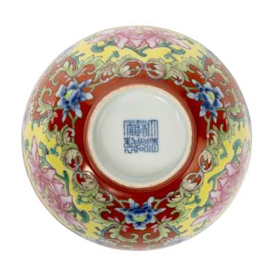 painted on three cartouches with blossoming peonies on a yellow ground enclosed by tendrils, against a coral-red ground decorated with scrolling flowers, the base inscribed with a six-character Daoguang mark in underglaze blue