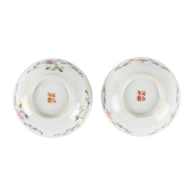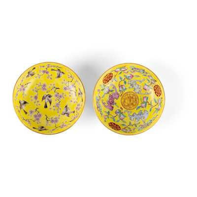one painted with magpies in flight with prunus branches, the other with three bats in flight within shou-roundels and peaches, both against yellow gound, the bases inscribed with a four-character Tongzhi mark in iron-red (2)