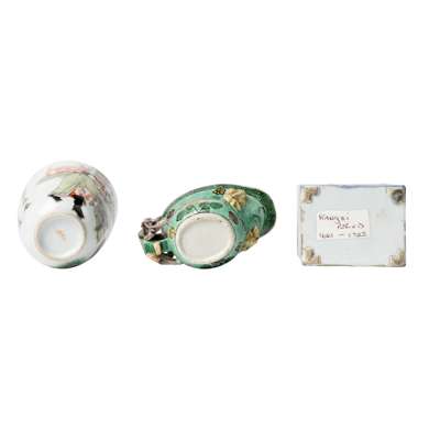 comprising: a famille verte cup painted with a scene from the classical novel Zhongqingli Ji, the base painted with a leaf motif mark; a susancai archaistic vessel, yi, set with a moulded luduan as handle, painted with flowers; and a wucai rectangular caddy with cover painted with chickens and floral (3)