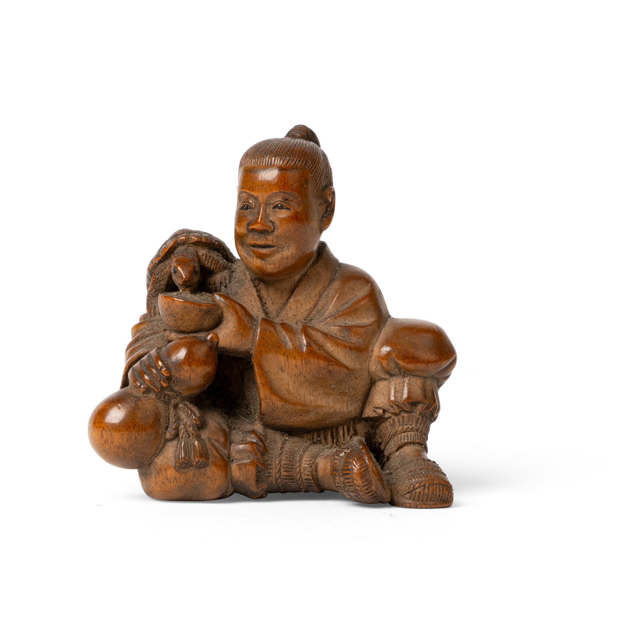 [PRIVATE SCOTTISH COLLECTION, RENFREWSHIRE] JAPANESE WOOD NETSUKE OF A FIGURE WITH MINOGAME