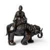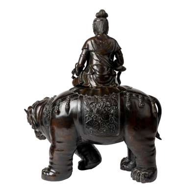 The magnificent example presented here is cast in generous proportions in three parts: the figure, the nyoi sceptre, and the elephant. The Bosatsu is distinguishable by his designated Elephant King vahana, which he sits on in latitasana.