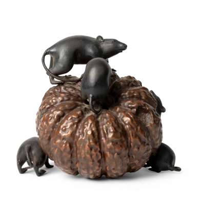 [PRIVATE ENGLISH COLLECTION, SOMERSET] JAPANESE BRONZE OKIMONO GROUP OF PUMPKIN AND RATS