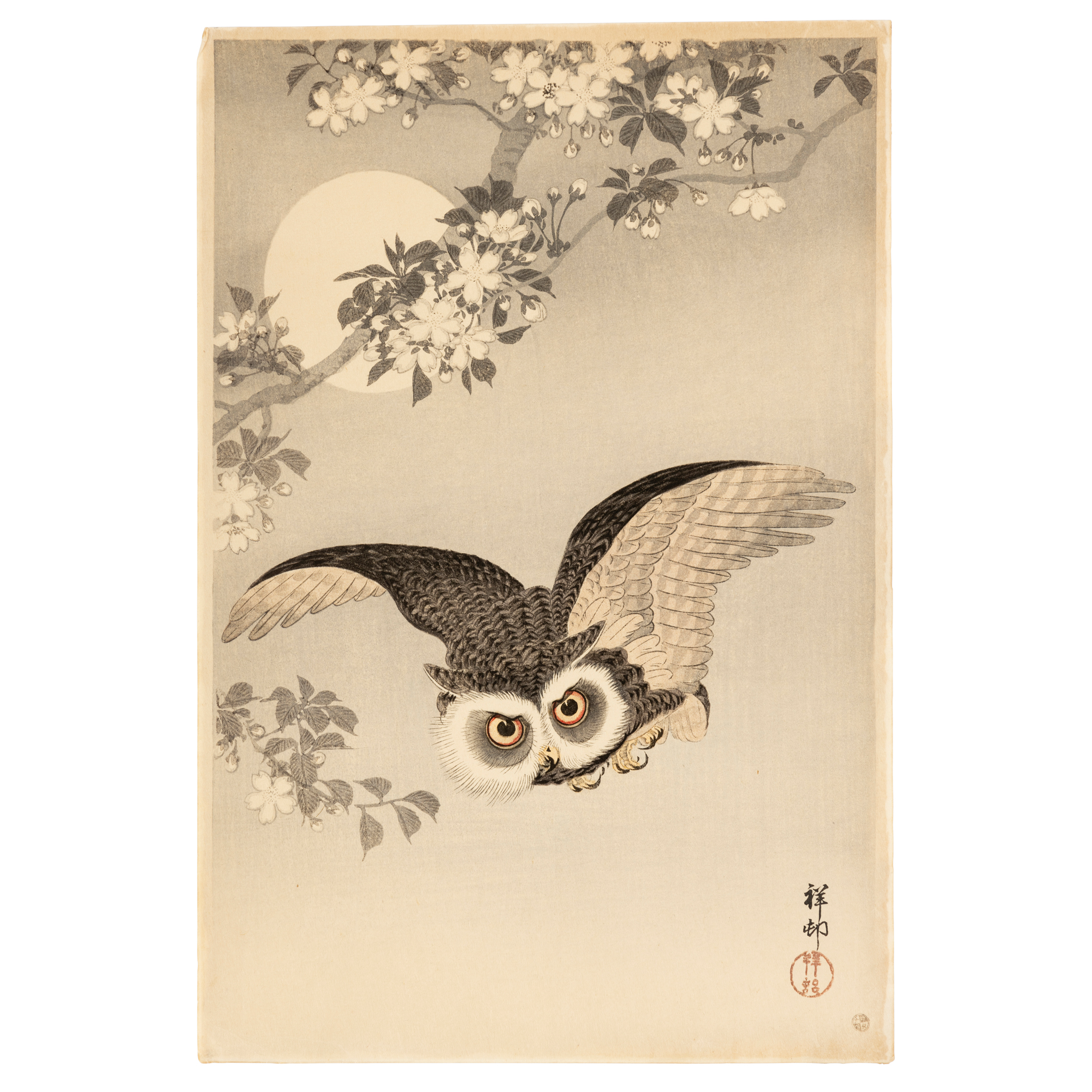 oban tate-e print, depicting a scops owl flying beneath a flowering cherry branch with the full moon behind, signed Shoson with seal Shoson, published by Watanabe Shozaburo
