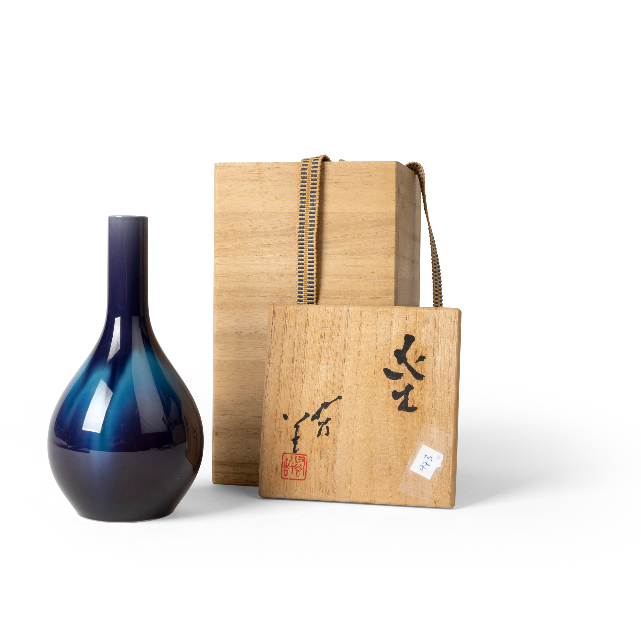 globular body rising to a long straight neck, covered overall in a rich, lustrous, blue-purple streaked glaze, with original wooden tomobako