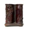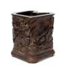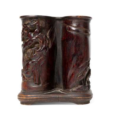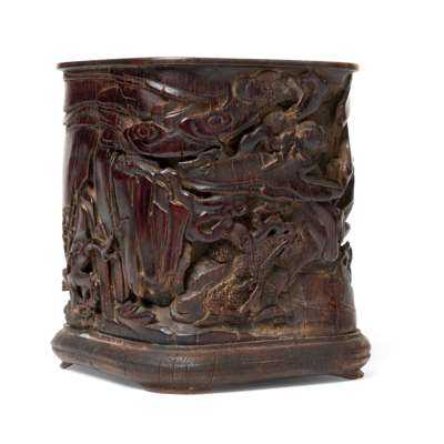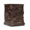 of squarish form with one concave side, decorated with gnarling pine trees in a shanshui landscape, one side further carved with figures on a sampan