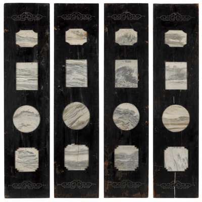comprising sixteen marble slabs in four wooden panels, each panel with four shaped windows showcasing the black, grey, and russet veining evocative of ethereal landscapes shrouded in swirling mists and clouds, inscribed with poetic titles, signed 'Shi Quan' etc, sealed (4)