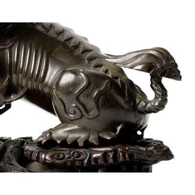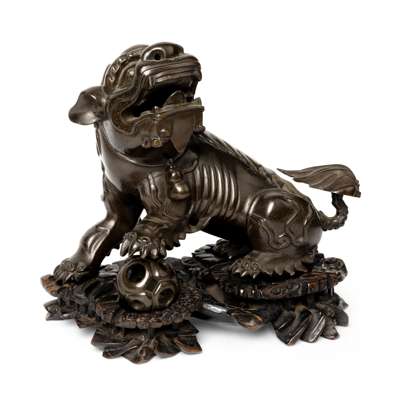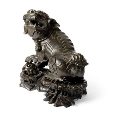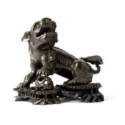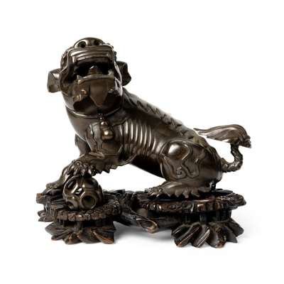 cast with the mythical beast seated and leaning to its rear right hind, the head striding to upper left looking back with mouth ajar, its front left paw on a movable brocade ball, inlaid overall with silver-wire as mane, the abdomen inlaid with a ‘Shi Sou’ mark, on a fitted wooden stand