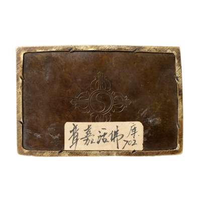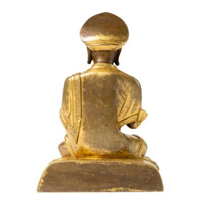 cast seated on a brocaded double-tiered cushion, with right hand raised in abhaya mudra, left hand in dhyana mudra, wearing long flowing robes incised on the hem with foliate motifs, wearing a broad mitre headdress, gilded on the garments, seat, and hat