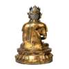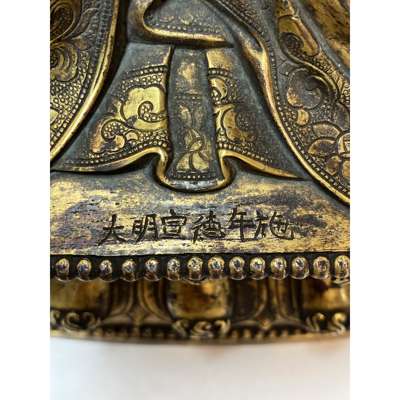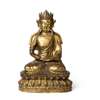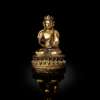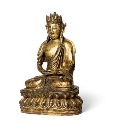 shown seated in dhyanasana on a waisted double lotus base, hands in dhyana mudra, wears long robes that drap naturally to the lotus seat, hem finely detailed with floral motif, right chest exposed, his serene face with downcast eyes flanked by pendulous ears decorated with large florette earrings, six-leaf crown topped the head enclosing an ushnisha, front of the throne carved with a six-character Xuande mark