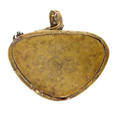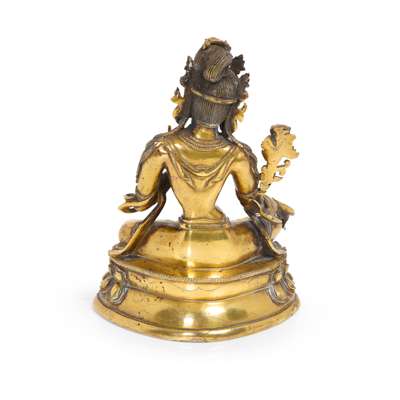seated in lalitasana on a double lotus pedestal, wearing a dhoti and five-leaf crown, the hands held in varada and vitarkamudra, next to one shoulder with a stemmed lotus, the base sealed with a plate incised with a double vajra