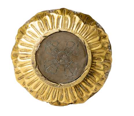cast seated in vajrasana on a single lotus base, hands on his lap in dhyanamudra, wears a dhoti, a cape and bejewelled, his face in serene expression with downcast eyes, hair combed in a chignon, the base sealed with a circular plate incised with a double vajra