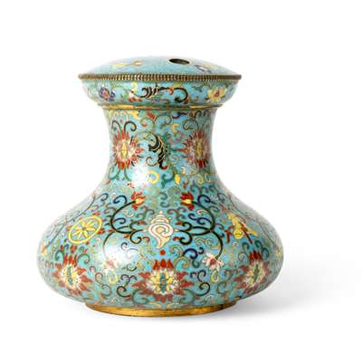 the compressed body supported on a short foot sweeping up to a broad waisted neck flaring to a galleried mouth sealed with a gently domed top save for three pierced holes, finely decorated with auspicious Buddhist emblems amongst scrolling lotus, all above a lappet band above foot, the top with ‘cracked-ice and prunus’ motif, centre of the base carved with a six-character Qianlong mark within a square panel on gilded ground