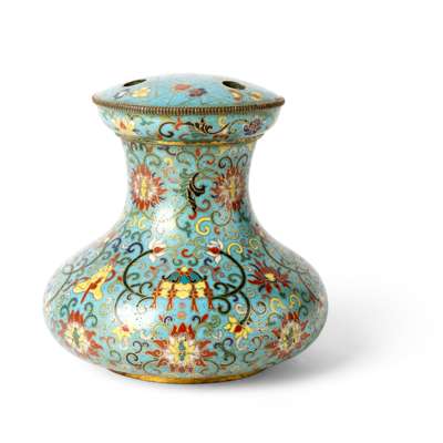 The same form of flower holder in cloisonne enamel is not found. But several related examples can be seen. Compare to one in cylindrical form with five apertures, decorated with Qianlong Imperial poem, previously in the Qing Court, now in the Palace Museum, Beijing, museum no. Gu 故119571. And one with three ram as feet, dated to the early Qing dynasty, same museum as above, museum no. Xin 新7032. For an earlier example, see one in the National Palace Museum, Ming dynasty, with applied mythical beast, museum no. Gu Fa 故琺761.