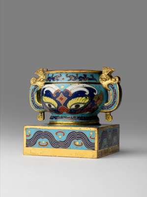 清 乾隆款 銅胎掐絲琺瑯饕餮紋簋式爐連座