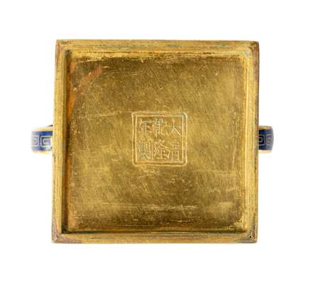 A comparable example of a small cloisonne enamel archaistic platformed vessel with cover, gui, Qianlong mark and of the period, was sold at Christie's Hong Kong, 30 May 2012, lot 4021