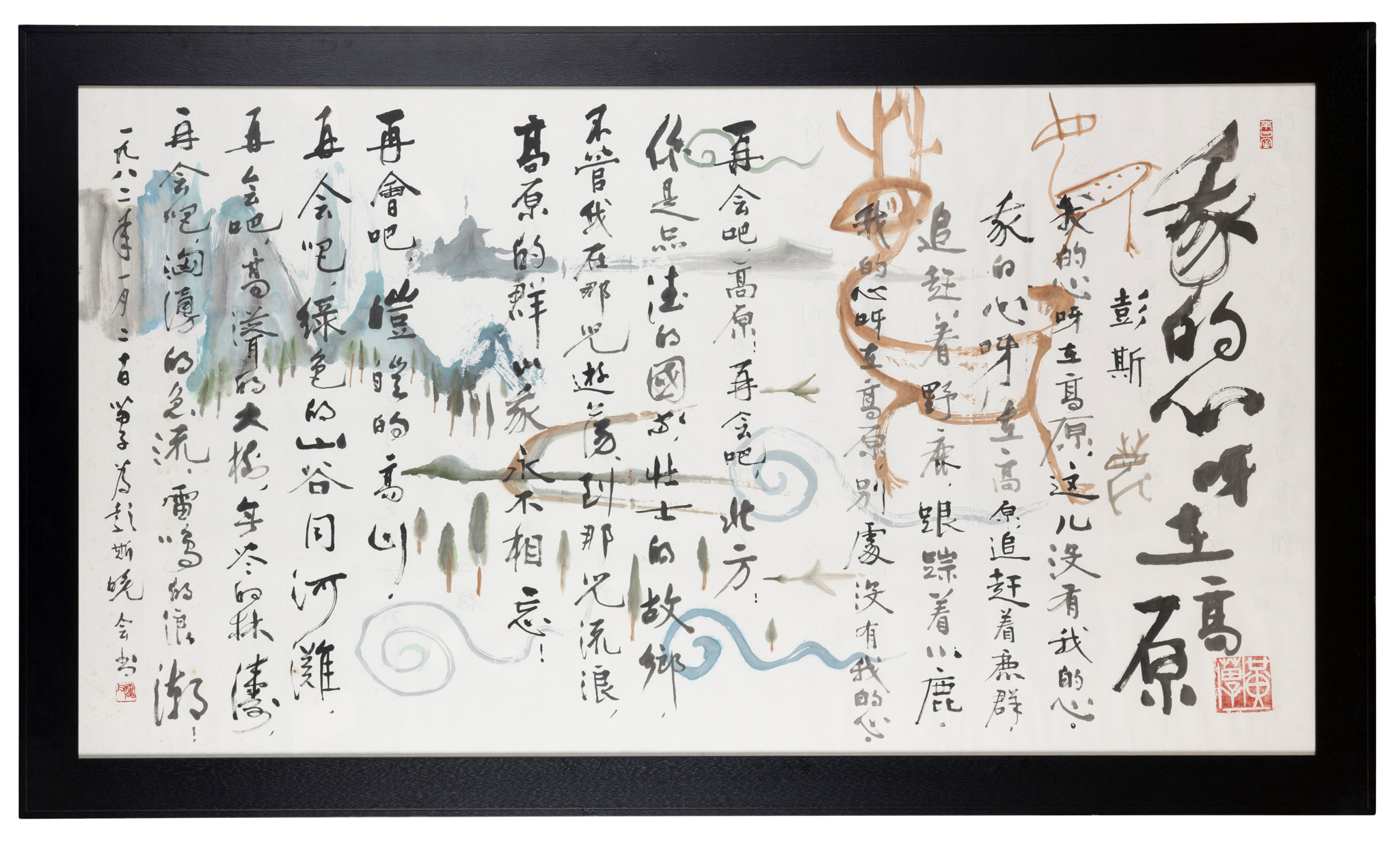 ink and colour on paper, painting and calligraphy of ‘My Heart's in the Highlands' in Chinese, titled on right, left margin dated January 20, 1982, dedicated to the corresponding Burns Night, three seals of the artist ‘Lairi Tang’, ‘Huang Miaozi’ and ‘Lei Fu’, framed