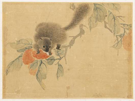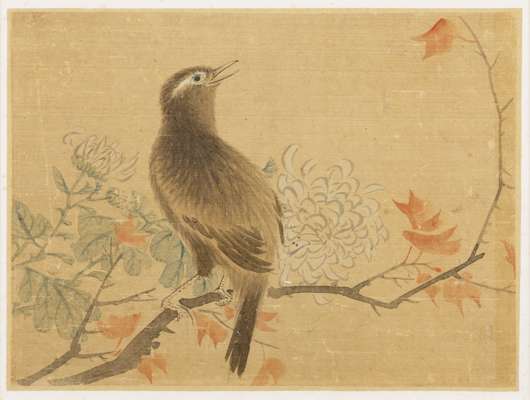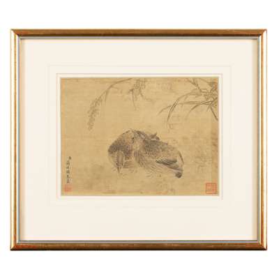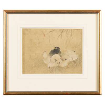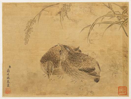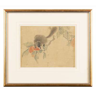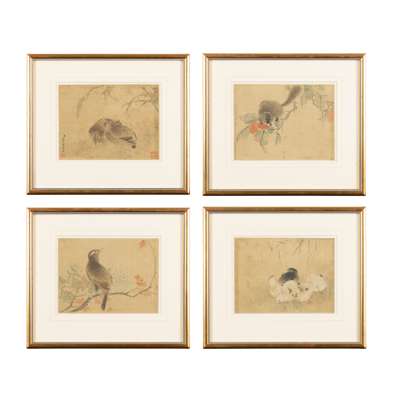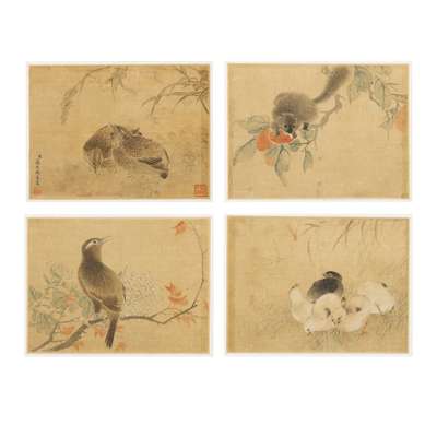 ink and colour on silk, one painted with two quails underneath rice stalks, signed Jiang Tingxi to the lower left, two seals of the artist; three further painted with bird perched on branch, the other with chicks, and the last with a squirrel on branch, unsigned, all framed (4)