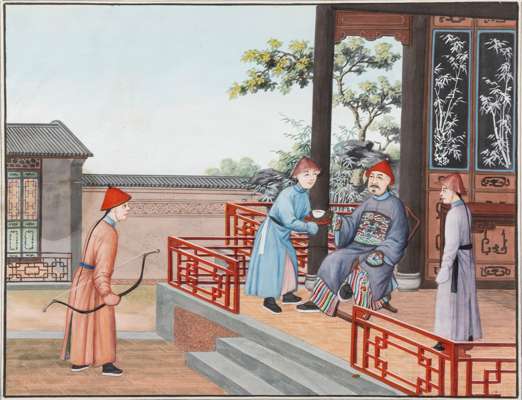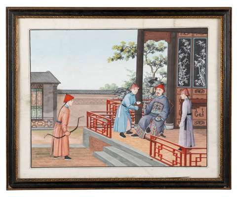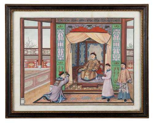 A comparable set of four large Chinese school gouache on paper court scenes, Qing dynasty, 19th century, was offered at Sotheby's London, 22 February 2022, lot 54.
