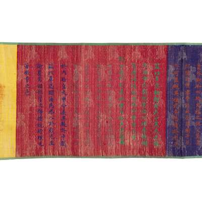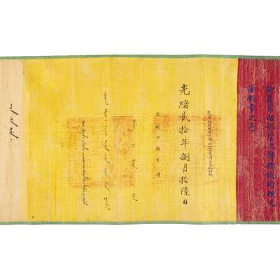 silk brocade woven to the opening section with two dragons flanking the character fengtian gaoming (‘imperial mandate of heaven’), and repeated at the other end in Manchu, the texts written in both Chinese and Manchu script, the yellow brocade impressed with two imperial seals and dated to the 16th day of the 8th month of the 20th year of the Guangxu reign (in accordance with 1894AD)
