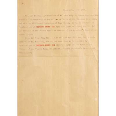 "Mr. Lin Cheung, - grandfather of Mr. Man King, a Chosen Perfect, the second class Secretary of the Office of Works of the Imperial Household, and with an Additional Promotion of Four Steps,- is to be ennobled by Proclamation of EMPEROR KWONG SUI with the title of ‘Chung Hin Tai Fu’ (an Officer of the Fourth Rank) on account of his grandson's loyalty and filial piety.
