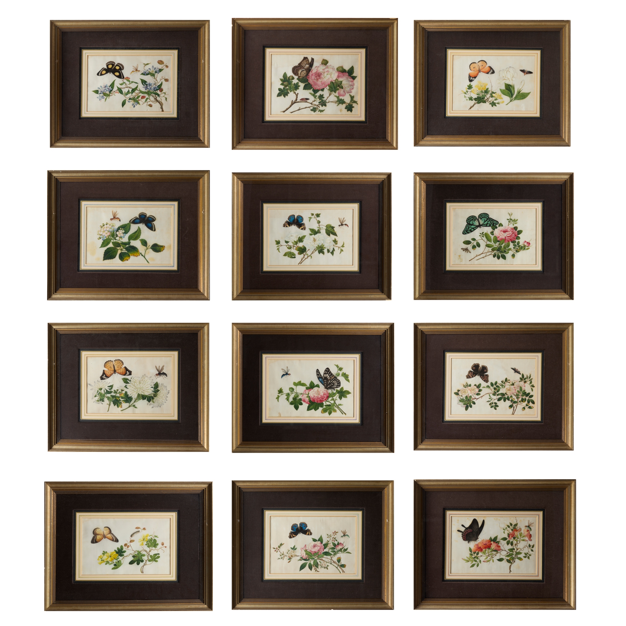 [PRIVATE SCOTTISH COLLECTION, PERTHSHIRE] SET OF TWELVE CHINESE EXPORT 'BUTTERFLY AND FLOWER' PITH PAINTINGS