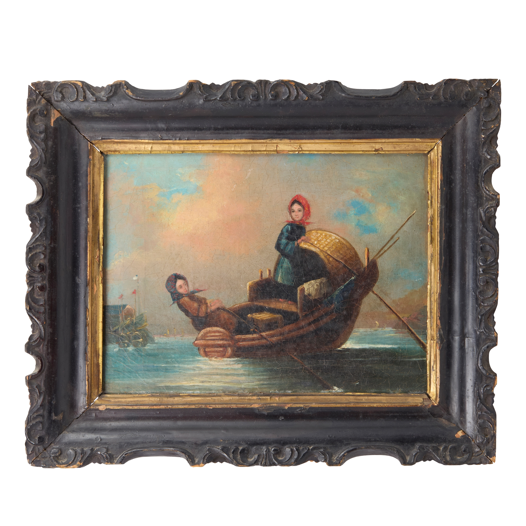 清 外銷油畫 仕女舢舨圖 帆布油彩 木框
