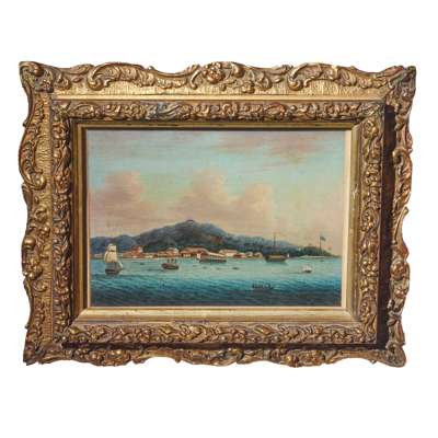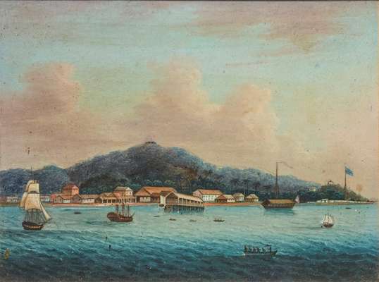 A highly comparable oil on brass painting of Penang, Chinese School, c.1800-1820, from the Kelton collection, was sold at Christie's London, 7 Nov 2019, part lot 9.
