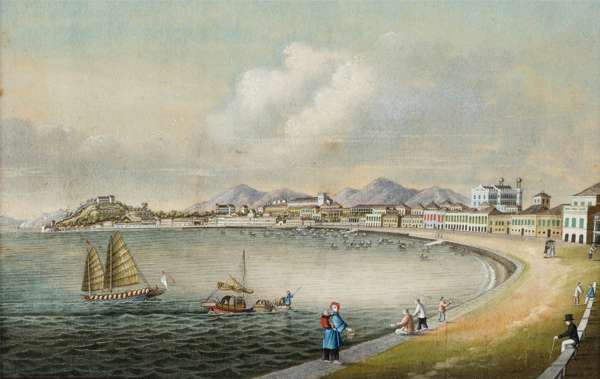 painted in the style of Ting Qua, depicting a view over Praya Grande in Macau, the tranquil bay with trading and fishing vessels plying the shallow waters of the bay, framed