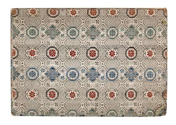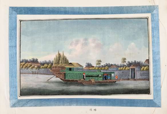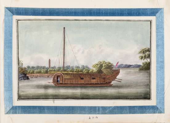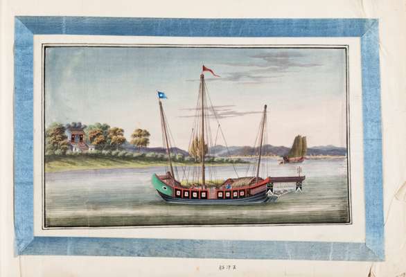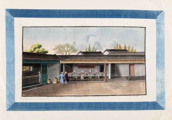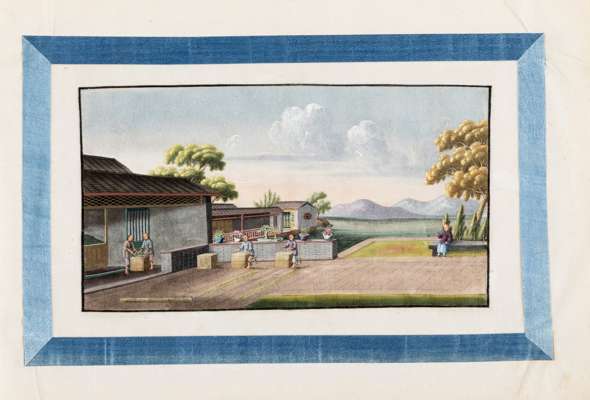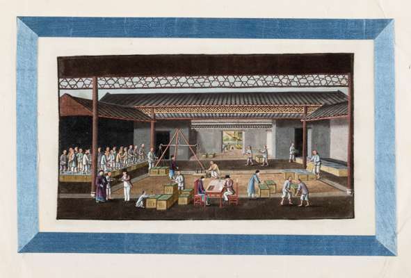 gouache on pith paper, eight depicting various stages of tea production and tea trade, including one where foreign merchants are trading with the local, buying crates of tea being weighed up on a large scale, three of junks for the tea trade, mounted with ribbon to paper leaves, brocade-covered cardboard covers (11)