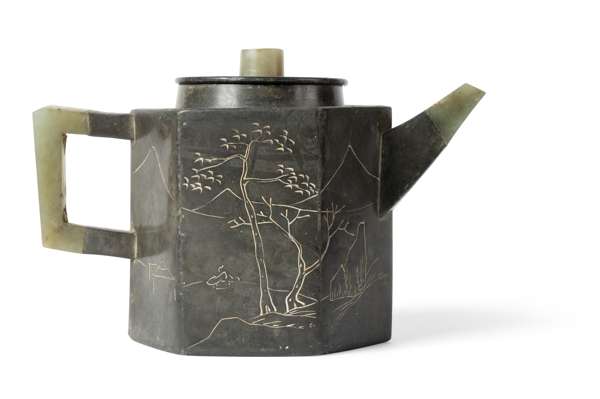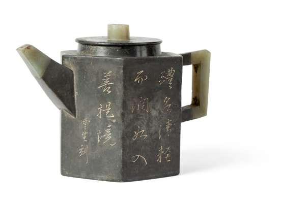 of hexagonal form, one side incised with shanshui landscape, the reverse with a poem and signed ‘Yun Sheng’, handle, tip of the spout and finial on cover set with jade