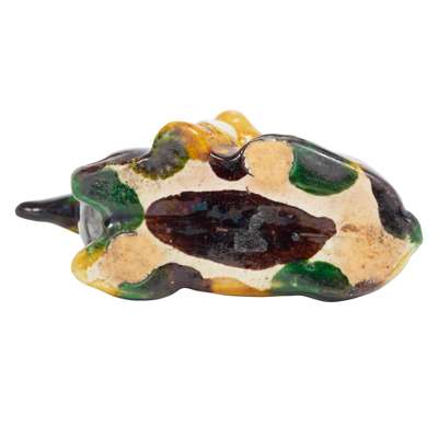 in the shape of a monkey riding a recumbent deer, its right hand holding a peach, the left palm on the deer's rear forming a handle, the monkey glazed in yellow with body detailed in carvings, the deer in a dark green glaze variegated with brown patches and a hint of yellow streaks