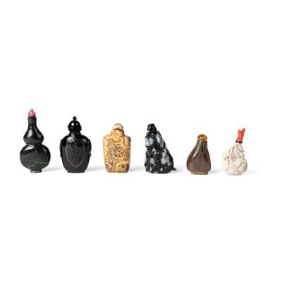 comprising: one gourd-form serpentine stone snuff bottle; one oval dark brown stone snuff bottle, possibly made of tiger's eye, carved in low relief with chrysanthemum flowers, flanked by two lion-head handles; one oblong pudding stone snuff bottle of plain sides; one dark with white spotted snuff bottle of gourd form; one pear-shaped snuff bottle of brown colour with speckles, possibly opal matrix; and one soapstone snuff bottle carved in mid relief with fruiting gourds on tendril branches; all with stopper (6)