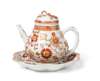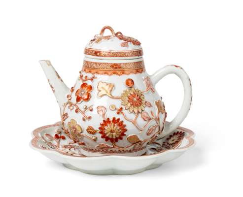 the pear-shaped teapot with a loop handle and straight spout, with applied decoration of prunus and other flowers, enamelled in iron-red and gilt, the cover and lobed stand similarly decorated (2)