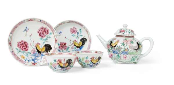 SET OF FIVE CHINESE FAMILLE ROSE 'COCKEREL' TEAWARES