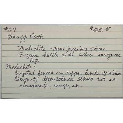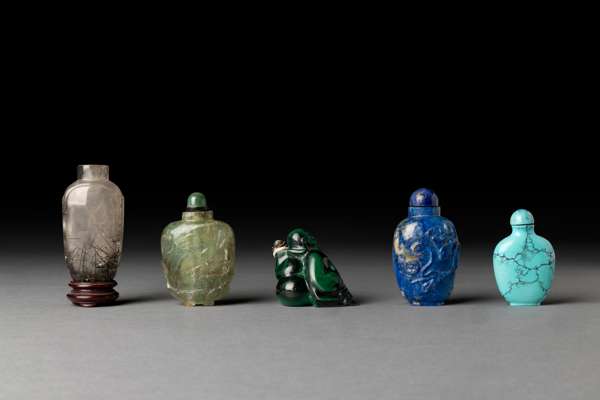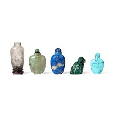 comprising: one rectangular hair crystal snuff bottle, without stopper, with wooden stand; one oblong green quartz snuff bottle carved in mid relief with lotus pond; one malachite snuff bottle carved in the form of a seated scholar; one oblong lapis lazuli snuff bottle carved with houses in landscape on one side, the reserve carved with a sprig of flowers; and one turquoise snuff bottle of plain sides with variegated dark veins; the latter four with stopper (5)