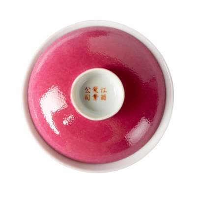 each set with exterior of the lid, bowl and saucer enamelled with bright pink colour, base of the bowl and inner well of the finial in the lid inscribed with a six-character Jiangxi Ciye Gongsi mark in iron-red (6)