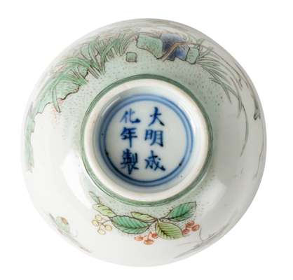 painted on the exterior with a bird perched on a branch adjacent to a floral bush, reverse with a butterfly in flight, the base inscribed with a six-character Chenghua mark in underglaze blue within two circles