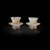 each cup thinly carved with rounded sides and everted rim, divided into six lobes, supported on a short foot, the stand carved as a six-lobed dish with gently curved sides, surrounding the raised platform in the centre that holds the cup, all above a tall and slightly splayed foot, the semi-translucent stone with some opaque white inclusions (4)